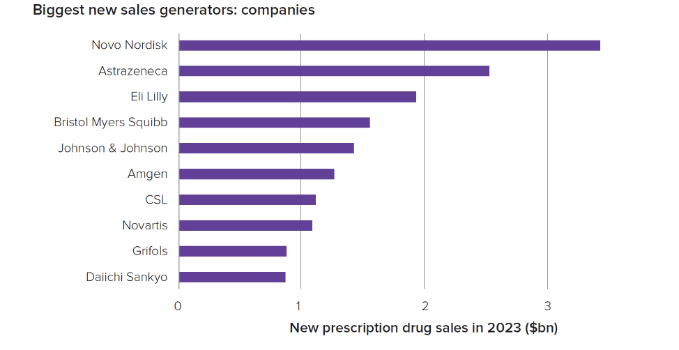 下图为2023年收入快速增长的药物公司预测,诺和诺德暂居第一。这两家公司将受益于对2型糖尿病和肥胖症药物Ozempic、Wegovy和Mounjaro的高需求。