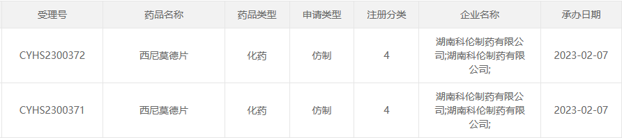 2月7日,湖南科伦制药递交的4类仿制化药西尼莫德片上市申请获CDE受理。目前,国内尚无该品种的仿制药获批生产。