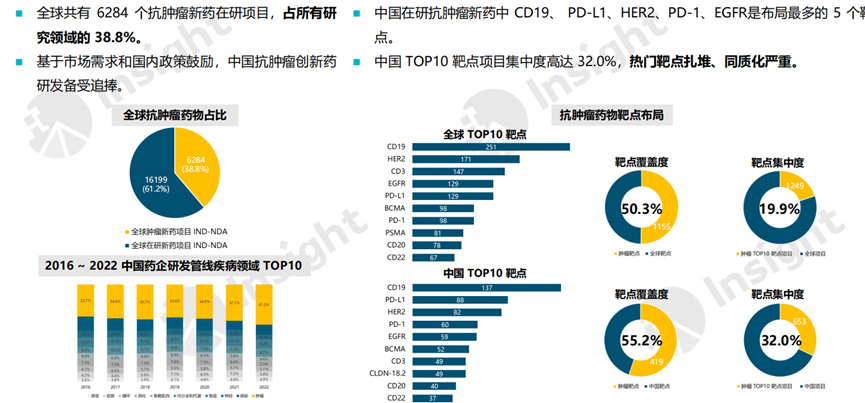 数据来源:Insight 数据库;数据说明:抗肿瘤药物统计范围包括研发阶段处于 IND-NDA 的新药项目;中国药企研发管线统计范围包括中国 IND-NDA 所有项目