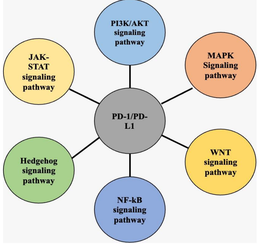 图1.调控PD-1/PD-L1表达的不同途径。PI3K/AKT通路、WNT通路、MAPK通路、NF-κB通路、JAK/STAT通路和Hedgehog(Hh)通路刺激PD-1/PD-L1的表达