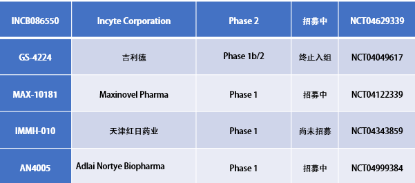 干扰PD-1/PD-L1通路的小分子的开发进展落后于抗体。开发阻断PD-1/PD-L1蛋白-蛋白相互作用的小分子抑制剂一直是一项艰巨的任务,因为它的界面大而平,缺乏一个深的结合口袋。BMS的研究人员解决了这个问题,并发布了一项关于PD-L1小分子抑制剂的专利,以及第一个共晶结构(BMS-8)/PD-L1的专利。至此以后,数10项基于PD-L1的专利相继发表。其中5种PD-L1小分子抑制剂已经进入了临床试验,比如来自Incyte公司的药物INCB086550,该公司在2021年9月刚刚进入II期临床试验(表2)。表2总结了2019年至2021年开发和揭示的新的小分子PD-L1抑制剂。