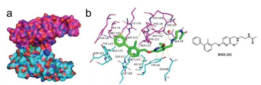自从基于药效团模型构建出第一个共晶结构的小分子PD-L1抑制剂,接踵而来的PD-L1抑制剂已经发表在专利和论文著作中,这些共晶结构包括5J8O,5J89,5NIU,5N2F,5N2D,6RPG,6R3K,7NLD,7BEA,6VQN。如图1所示的BMS-202/PD-L1配合物的晶体结构显示,BMS-202结合在PD-L1二聚体的界面上形成一个圆柱形的疏水口袋。BMS-202的远端联苯母核通过与附近氨基酸的π-烷基相互作用而稳定,并与Tyr56的侧链形成π-堆叠相互作用。甲氧基-吡啶部分的主要相互作用是π-π与BTyr56的堆叠。扩展的N-(2-氨基乙基)乙酰胺基团向溶剂区域延伸,并产生许多静电相互作用。