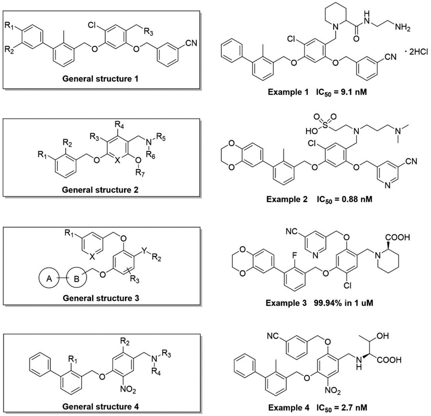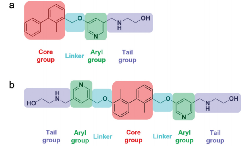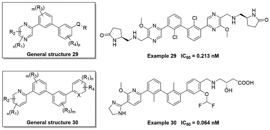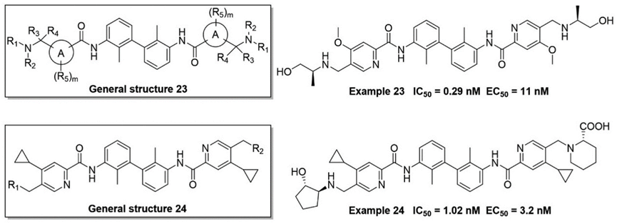 Abbisko公司的科学家披露了一系列对称的化合物,作为新一代的PD-1/PD-L1拮抗剂,用于治疗癌症、感染性疾病和免疫相关疾病(图9)。在ICR小鼠中测试了几个候选化合物的药代动力学行为。结果表明,其最佳化合物23在HTRF实验中IC50为0.29 nM,在细胞实验中EC50为11 nM。然而,它表现出较差的药代动力学特征,半衰期为2.4 h,AUClast小于500小时*ng/mL。