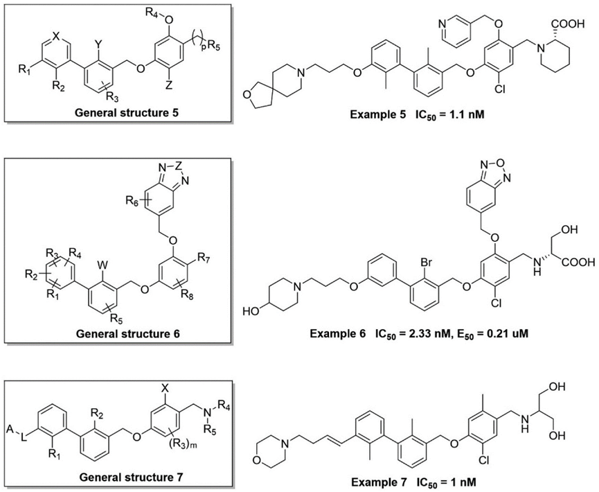 随后,上海药物研究所(中国科学院)的化学家合成了1,3-二羟基苯基衍生物(图3)。这一系列化合物中使用了不同类型的可溶性基团,例如,为尾基团引入了磺酸和聚醇。是最有效的分子之一,化合物2在体外PD-1/PD-L1结合试验中显示出半抑制浓度为0.88 nM。同时,在剂量为40 mg/kg的药效实验中,化合物2能够显著抑制黑色素瘤模型中的肿瘤生长。在另一项专利中,上海有机化学研究所(中国科学院)披露了106个具有相似结构的化合物。在HTRF结合试验中,当浓度为1 μΜ时,化合物3对PD-1/PD-L1相互作用的抑制率为99.94%。中国药科大学已经申请了49个使用硝基苯作为芳基部分的分子专利。化合物4在体外阻断PD-1/PD-L1相互作用的IC50为2.7 nM,对Lewis肺癌(LLC)细胞没有显现出细胞毒性。此外,化合物4能够单独依赖性地提高干扰素-γ的产生,并抵消PD-1/PD-L1诱导的免疫抑制。阳光湖制药公司的化学家揭示了多个抑制PD-1/PD-L1相互作用的小分子,这也属于第一类药效团,但在核心基团中引入一个具有不同末端螺旋或融合环的脂肪族外醚链(图4)。Cisbio检测中对PD-1/PD-L1相互作用的体外抑制作用显示,最有效的化合物为5,IC50为1.1 nM。中国药科大学还申请了另一项专利,该专利采用了脂肪醚链,该链与联苯核心基相连,在大多数情况下使用不同的伯胺或仲胺作为末端基。据报道,分子6在体外抑制PD-1/PD-L1结合,并在细胞实验中显示有效,IC50值为2.33 nM、EC50为0.21 μM。深圳微芯生物制药公司也公开了一项具有26种生物芳基衍生物的专利,它们可以与PD-L1蛋白结合。主体结构如7所示,脂肪链由烯烃而不是醚连接剂引入到末端苯环。化合物7在HTRF结合试验中显示其半抑制浓度值为1 nM。