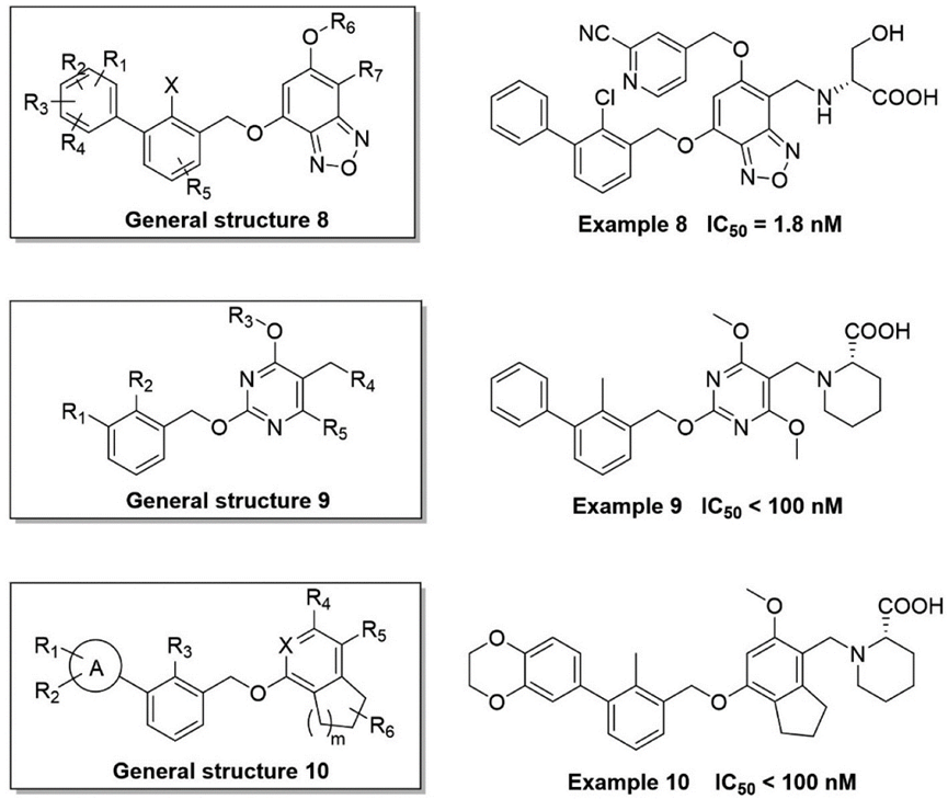 中国药科大学申请了另一项46种PD-L1小分子抑制剂的专利。基本结构如8所示(图5)所示,以苯并-[c]恶二唑核心作为芳基组分。在HTRF结合试验中,8的IC50值为1.8 nM,体外活性最好。Jubilant Biosys Limited的化学家也发表了两项1,3-二羟基苯基衍生物的专利,其母体结构为9和10,都属于第一类药效团,并具有相似的核心结构。结构9以嘧啶为芳基,在10的结构中引入了二氢乙烯或1、2、3、4-四氢萘。同样地,它们的两个尾基团都位于乙醚连接体的对位位置。这两项专利中,9和10在HTRF结合试验中IC50值小于100 nM。