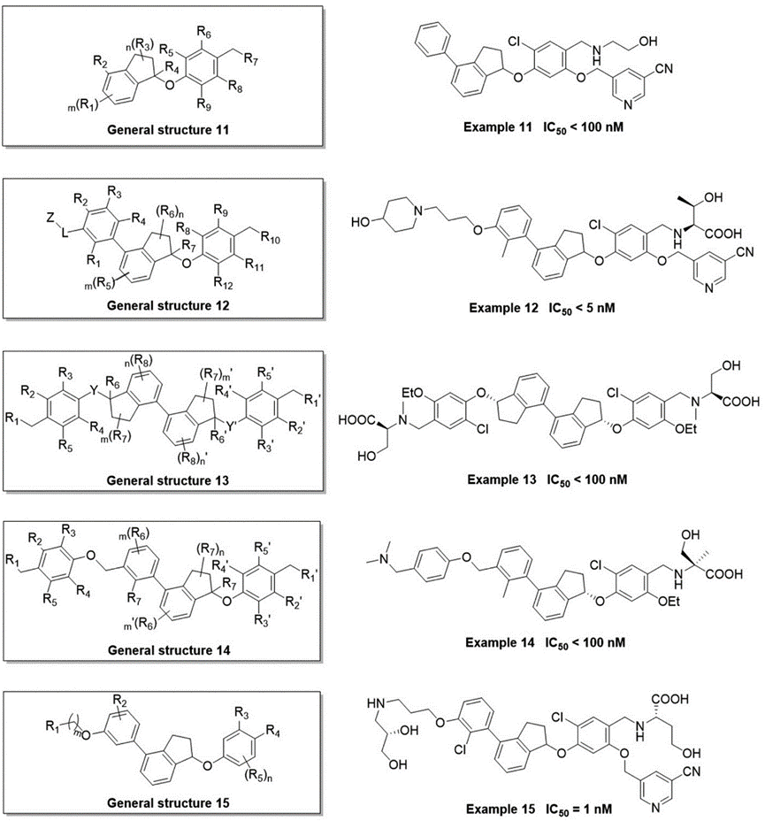 环化醚连接剂:ChemoCentryx公司申请了三项专利,公开了四个系列的化合物,其母体结构为11、12、13和14。(图6)这些专利中的所有化合物都使用了一个连接在核心和芳基之间的环化醚链。此外,它们有相似的芳基和尾基。母体结构为11的化合物,其中11的IC50值小于100 nM。12有一个额外的线性醚链与核心基团连接,IC50小于5 nM。所有报道的母体结构为13的分子是对称的。14的结构在其核心基团上有一个罕见的取代苯酚基团,分子14的IC50小于100 nM。百时美施贵宝(BMS)的研究人员也报道了具有环化醚链的小分子PD-L1抑制剂,其母体结构为15。化合物15在体外抑制PD-1/PD-L1的IC50值为1 nM。