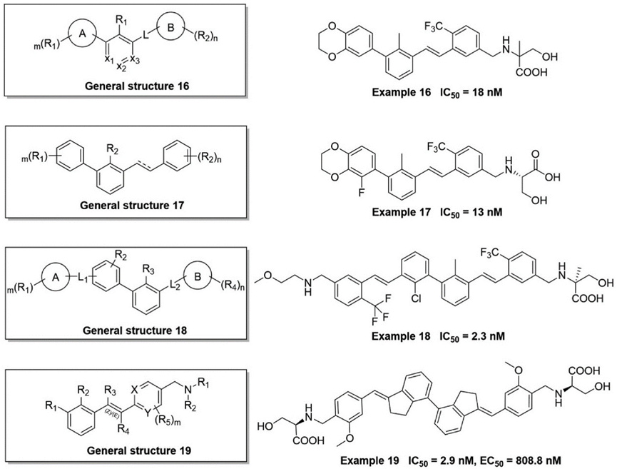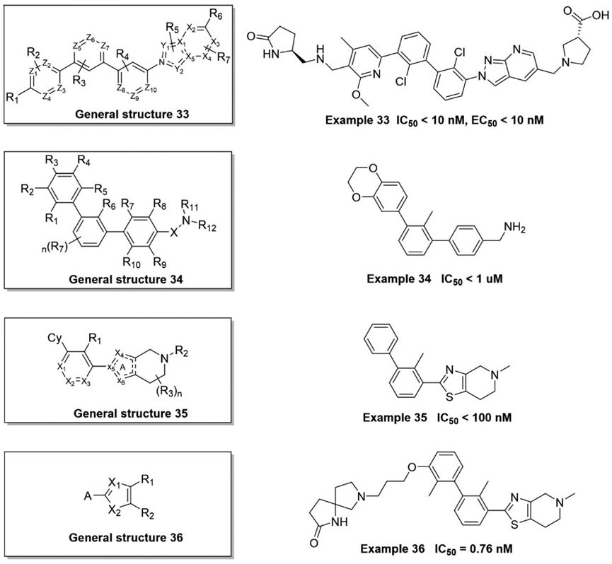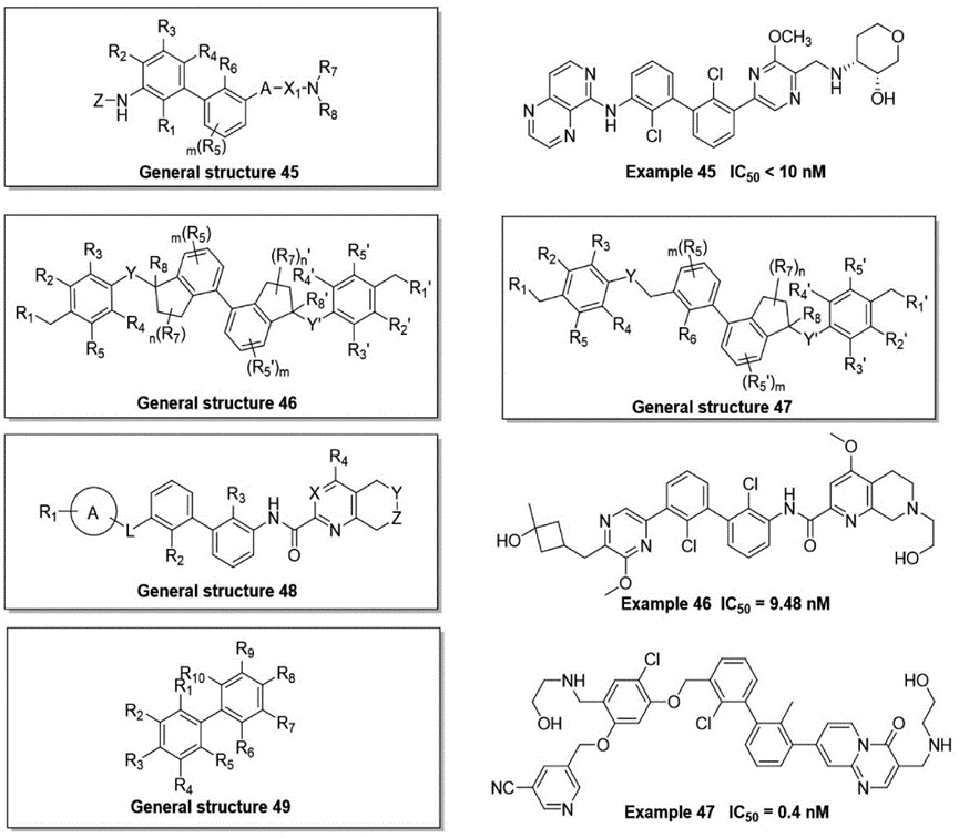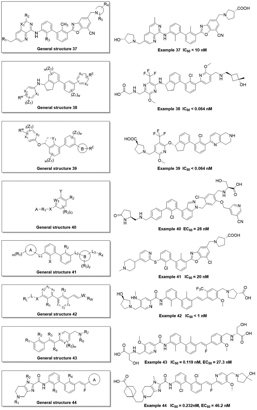 PD-L1抑制剂与两种不同的连接剂结合:除了上述化合物外,仍有一些PD-L1抑制剂在核心基团的两侧都有两个不同的连接体。这类化合物一般属于第二类药效团,具有不对称的结构。这些化合物可以调节PD-1/PD-L1蛋白-蛋白相互作用,增强对疾病和传染性疾病的免疫力。图15总结了结构37-49。其中,吉利德开发的化合物38和39,体外活性显著,IC50小于0.064 nM。