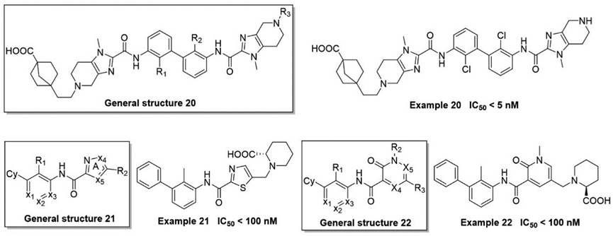 PD-L1抑制剂与酰胺连接剂:除了乙醚和烯烃连接剂,酰胺也另一种替代连接剂。酰胺连接子最先由Incyte披露,后来被采用其他几家公司。Incyte继续为PD-L1抑制剂开发PD-L1抑制剂,从2019年开始发布了3项专利,突出了酰胺连接剂的结构。(图8)以20、1-甲基-4、5、6、7-四氢-1H-咪唑[4,5-c]吡啶为芳基,本专利公开的所有化合物均属于第二类药效团。这些化合物的双酚核、酰胺连接体和芳基是对称的,但引入了不同的尾基。带有末端羧酸的桥接环通过左侧的乙基连接体与双酚基连接,而另一侧使用各种取代物。专利US2020/0172533,使用五元杂环作为芳基,在示例21中使用了一个噻唑基团和尾部被l-哌唑啉酸取代。同样,在专利US2020/0283423中,使用六元杂环作为芳基,示例22中使用A1-甲基吡啶-2(1H)一组,并且使用相同的L-哌啶酸作为尾部。在体外PD-1/PD-L1结合试验中,21和22的半抑制浓度均小于100 nM。