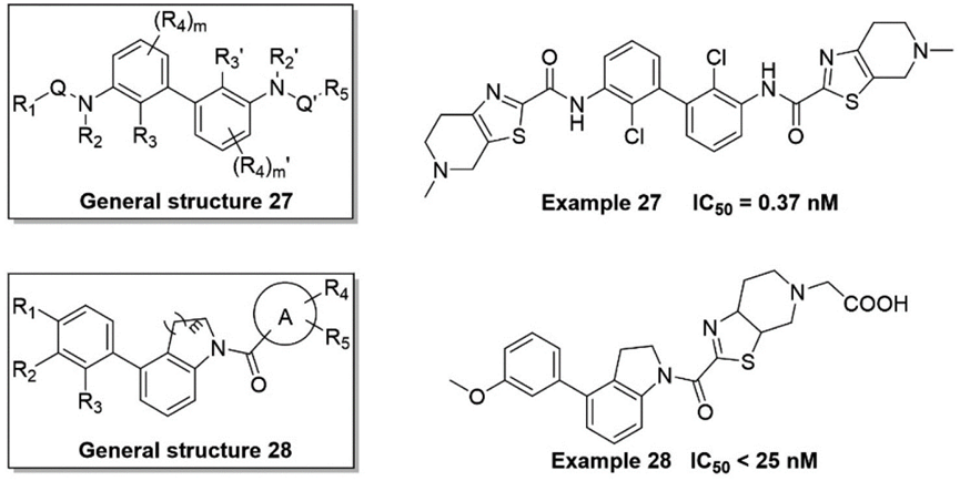 贝达制药公司的化学家们披露了两项以酰胺为连接剂的专利(图11)。其化合物属于第二药效团,大部分具有对称或半对称的结构。对称化合物27在体外阻断PD-1/PD-L1结合时,其IC50值为0.37 nM。对于28的一般结构,连接体仅限于一个环化酰胺,m为0、1、2或3。环A是一个五元和六元杂环。本专利中包含了58个化合物的实例,其中大多数在HTRF结合试验中IC50值小于25 nM。