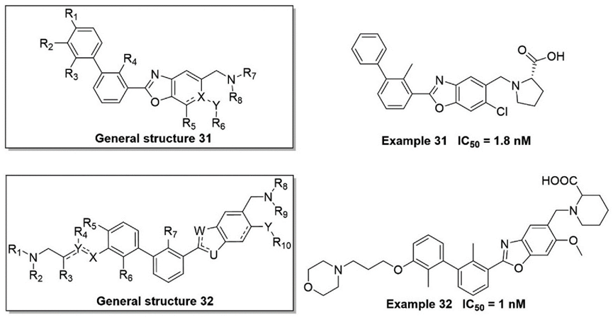 贝达制药公司的化学家还披露了两项专利,其中使用苯并[d]恶唑作为直接附着在双苯酚核心上的芳基(图13)。在化合物31的芳基和亲水性部分,Y为O、S、NR9-;R6为H、卤素、CN、C1-8烷基、C1-4卤烷基、磺酰,磺烷基,分子31在PD-1/PD-L1 HTRF结合试验中IC50为1.8 nM。