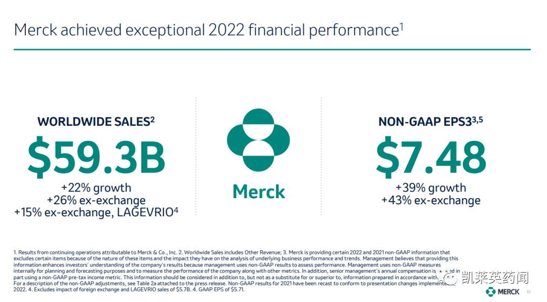 2月2日,默沙东公布2022年业绩,全年总营收593亿美元,同比增长22%;扣除新冠药Lagevrio(莫诺拉韦),同比增长12%。其中,制药业务收入520亿美元,同比增长22%。旗下Keytruda和Gardasil/Gardasil 9销售额合计达278.34亿美元,占公司销售额一半以上;除此以外,肿瘤药物Lynparza(奥拉帕利)和Lenvima(仑伐替尼),以及急救护理药品Bridion(舒更葡糖钠)、Prevymis(来特莫韦)和Dificid(非达霉素)的销量增速十分可观。除肿瘤领域外,公司提升了代谢疾病、免疫学、传染病,神经科学和疫苗等领域的项目占比,并在未来加强投资关键技术,包括环状RNA技术、个性化癌症疫苗、环肽技术、抗体偶联药物、细胞疗法(包括双特异性和三特异性T和NK细胞)、异基因细胞疗法、分子靶向疗法。