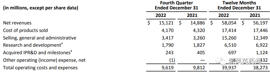 2月9日,艾伯维公布2022年业绩,全年种营收581亿美元,同比增长3 %。公司主营业务聚焦在自身免疫性疾病、血液肿瘤、美容、神经疾病、眼科等领域。在免疫性疾病领域,Humira(修美乐,阿达木单抗)年销售额再创历史新高,达到212.37亿美元,险胜Keytruda,继续蝉联“药王”宝座。据业内人士预测,随着安进开发为首的阿达木单抗生物类似药正式进入美国市场,Humira也许是“称王”的最后一年;然而Skyrizi(瑞莎珠单抗)和Rinvoq(乌帕替尼)强势补位,2022年均以50%以上的增长,奠定艾伯维在全球自免领域不可撼动的领导地位。在肿瘤领域,Imbruvica(伊布替尼)作为代表性药物,市场份额大幅度流失,然而Venclexta(维奈克拉)近几年维持了较好的增长势头;公司靶向CD3/CD20双抗Epcoritamab、双靶点抑制剂Navitoclax,以及靶向c-Met抗体偶联药物Teliso-V的开发处于研发后期。在神经领域,偏头痛药物Ubrelvy(ubrogepant)、Qulipta(atogepant)是CGRP抑制剂赛道的头号玩家;Vraylar(cariprazine)作为一款非典型抗精神病药,2022年实现20.38亿美元的销售收入;帕金森症(PD)药物ABBV-951和阿尔茨海默症(AD)药物ABBV-916同样处于研发后期。在医美领域,Botox(A型肉毒毒素)和Juvederm(玻尿酸)在2022年销量分别是26和14亿美元,销量十分可观。