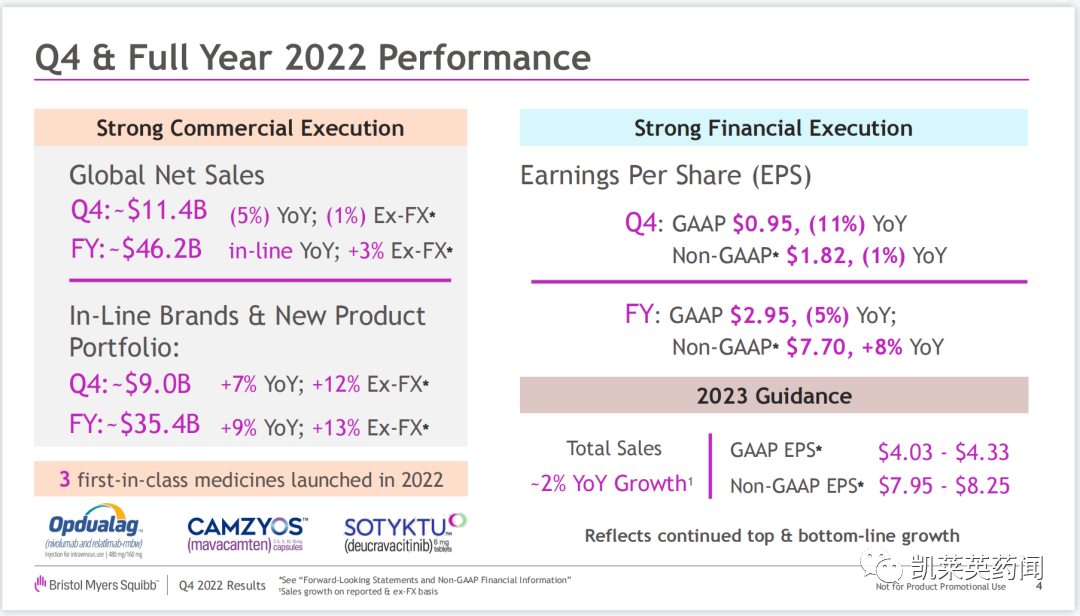 2月2日,BMS公布2022年业绩,全年总营收462亿美元,同比增长3%;从治疗领域看,BMS的业务主要集中在肿瘤、血液、免疫三大领域,并在拓展细胞治疗和心脑血管等新的业务增长点。2022年前十大核心药物的营收合计431.89亿美元,贡献了超93%的营收。其中成熟产品以抗凝药Eliquis(阿哌沙班)、肿瘤药Opdivo(纳武利尤单抗)、Pomalyst(泊马度胺)、Orencia(阿巴西普)以及Yervoy(伊匹木单抗)为代表,总收入333亿美元,同比增长7%,占2022年全年收入的72%。新上市产品收入20亿美元,较2021年大幅上涨87%;过专利期产品收入108亿美元,较2021年下降23%。2022年,BMS共上市3款first in class新药,分别是双免疫疗法Opdualag(首个 PD-1 /LAG-3 抗体组合疗法),心肌肌球蛋白抑制剂Camzyos(治疗肥厚型心肌病药物)和TYK2抑制剂Sotyktu,销量分别是2.5亿美元、2400万美元和800万美元。BMS的困境主要在于其主要收入来源均面临专利悬崖问题。据预测,到2030年,BMS可能被仿制药蚕食的业绩预计将高达2025年总收入的47%。在2023JPM大会上,BMS宣布将在2022年至2024年期间用约500亿美元现金流加码内外部创新管线。从过往的交易来看,BMS重点关注细胞疗法、蛋白质降解剂、新靶点药物。