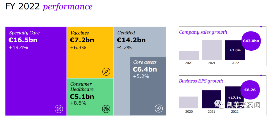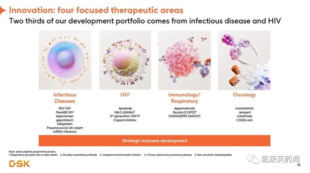 2月1日,GSK公布2022年业绩,总营收293亿英镑,同比增长19%。GSK将业务来源分为特药、疫苗以及普药三大块,其中特药收入高达113亿英镑,同比增长37%;普药收入101亿英镑,同比增长5%。除新冠中和抗体Xevudy收入增长外,特药作为GSK业绩增长的关键支柱,主要包括艾滋病(HIV)、肿瘤、呼吸系统免疫炎症和流行病四大领域。其中,HIV业务产品收入高达57亿英镑,同比增长20%;长效HIV疗法Cabenuva(卡替拉韦/利匹韦林)自2021年1月获批以来,仅两年时间销量已高到3.4亿英镑。肿瘤学是近些年加大布局的领域,上市产品的表现均不尽如意。Benlysta(贝利尤单抗)和Nucala(美泊利单抗)代表免疫炎症领域表现不错,分别实现11(+31%)和14(+25%)亿英镑的收入。