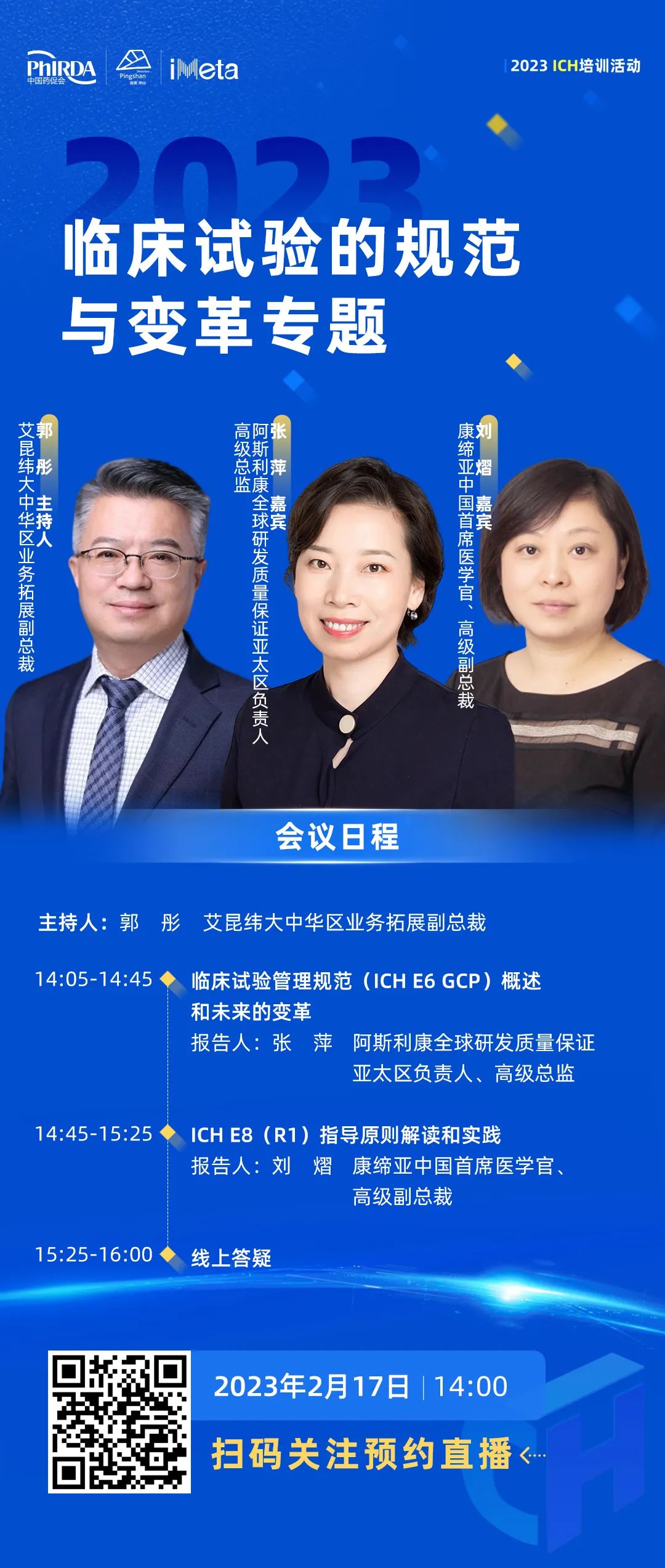 第三期中国药促进会ICH指导原则系列培训将于2月17日14:00与大家见面,本期主题为“临床试验的规范与变革”。会议特邀阿斯利康全球研发质量保证亚太区负责人、高级总监张萍与康缔亚中国首席医学官、高级副总裁刘熠担任主讲人,艾昆纬大中华区业务拓展副总裁郭彤担任主持人。届时三位专家将就临床试验的规范与变革的要点和难点进行案例分析与深度解读,并对观众提出的个性化问题予以解答和讨论。届时将通过“中国医药创新促进会”视频号直播,欢迎线上观众实时交流互动。