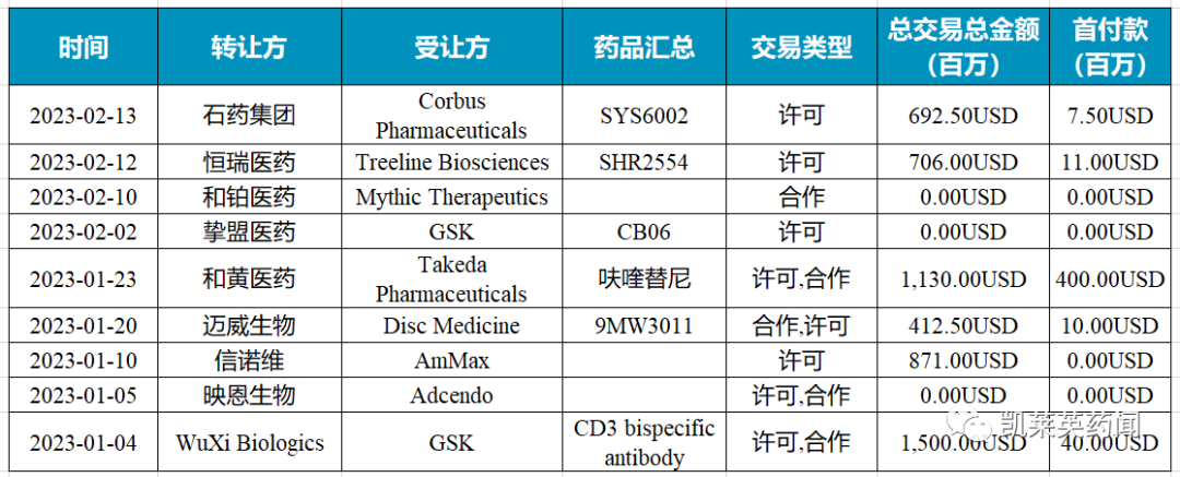 2023年,国内Biotech出海欲望极强,截止目前,共发生9笔license out交易,累计首付款高达4.69亿美元,总交易高达53.12亿美元。其中仅在刚刚过去的四天,石药、恒瑞、和铂先后发布license out公告。
