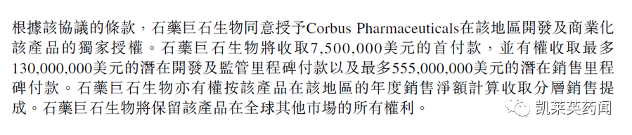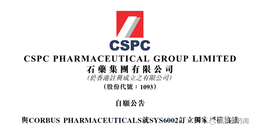 2023年2月13日,石药集团(1093.HK,最新市值1050亿港元)发布公告称,附属公司巨石生物制药有限公司(简称“巨石生物”)已与美国生物制药公司Corbus Pharmaceuticals, Inc.签署独家授权协议。