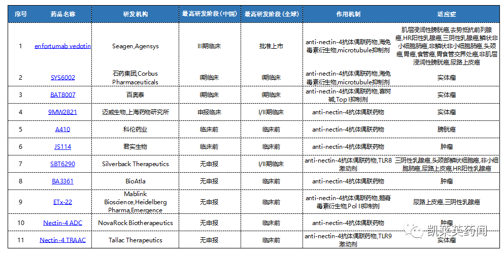 目前全球靶向Nectin-4的ADC在研药物一共有11款,其中Enfortumab Vedotin(商品名PADCEV™)已于2019年12月获FDA批准上市,用于治疗局部晚期或转移性尿路上皮癌的成年患者,先前接受过程序性死亡受体1(PD-1)或程序性死亡配体1(PD-L1)抑制剂的治疗,并在新辅助/辅助治疗、局部晚期或转移性疾病治疗中已接受了一种含铂化疗方案;在国内已于2022年5月获批尿路上皮癌的III期临床试验。