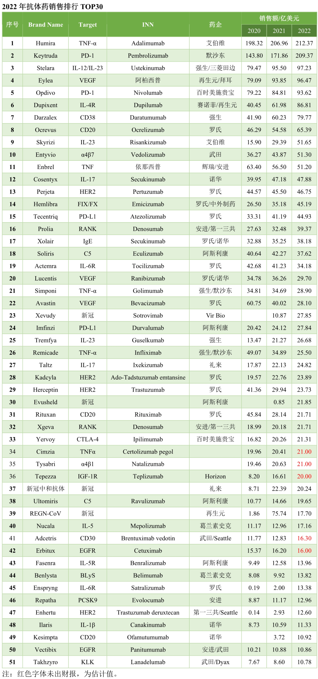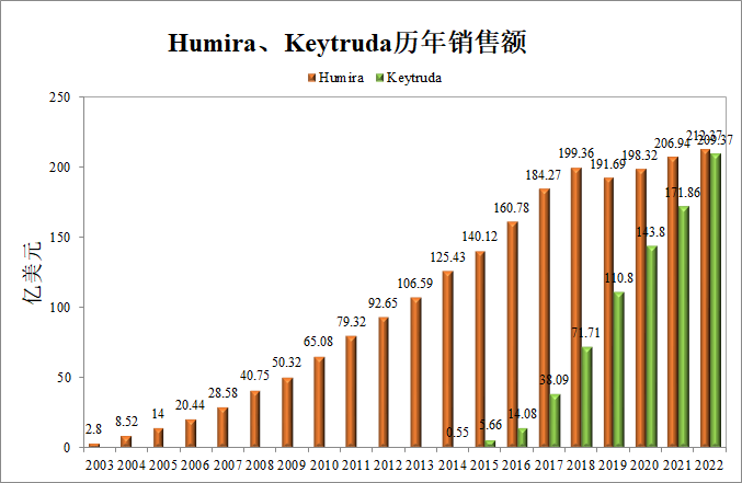 Humira、Keytruda为唯二的销售额破200亿美元的创新药(新冠产品除外)。Keytruda从2023年起将登顶新一届药王。