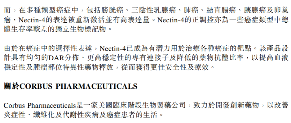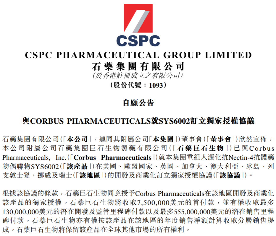 2023年2月13日,石药集团发布公告,将Nectin-4 ADC的在美国、欧盟、英国、加拿大、澳大利亚、冰岛、列士敦士登、挪威以及瑞士的权益授权给Corbus Pharmaceuticals,后者支付750万美元预付款,1.3亿美元开发及监管里程碑金额,5.55亿美元销售里程碑金额,以及一定比例的销售分成。合同总金额高达6.925亿美元。