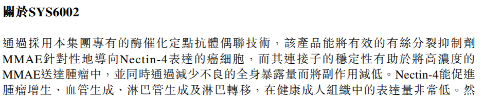 SYS6002为采用MMAE作为payload的Nectin-4 ADC新药,石药集团此前还申报过HER2 ADC和Claudin18.2 ADC。石药集团的Claudin18.2 ADC也已经授权出海,授权给Elevation Oncology。后者支付2700万美元预付款+1.48亿美元开发及监管里程碑金额+10.2亿美元销售里程碑金额,以及最高双位数比例的销售分成。