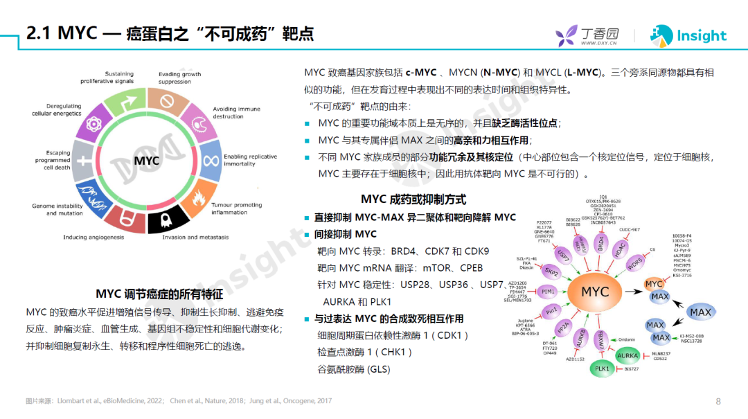 肿瘤的增殖与正常细胞不同,它通常不依赖于外源的生长信号,而是通过自给自足的方式生长。这一特征主要由三大机制决定,分别涉及了胞外生长信号、跨膜转导受体和胞内信号通路的改变,与之相关的潜力靶点主要包括 MYC、MALT1、TNKS 和 CBP/p300。