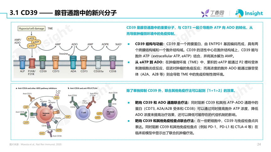 CD39 是腺苷通路中的重要分子,与 CD73 一起介导胞外 ATP 向 ADO 的转化,从而导致肿瘤微环境中的免疫抑制。从成分类别上来看,CD39 靶向的项目以抗体类为主,单抗居多,其次是双抗和抗体类融合蛋白。此外还有公司在开发直接抑制 CD39 表达的寡核苷酸药物。