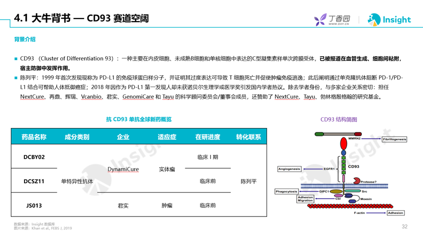 由陈列平担任联合创始人的 DynamiCure 已将该公司研发的 CD93 药物推进至 I 期临床研究阶段。国内君实生物的 CD93 阻断剂 JS013 拟启动 I 期临床,布局胰腺癌、肾癌、头颈癌和结直肠癌等实体瘤。
