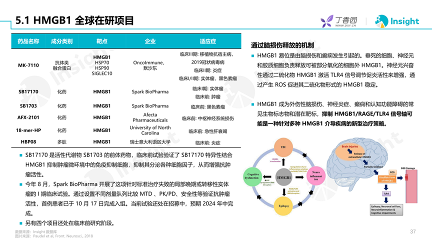 HMGB1 是一种染色质蛋白,其表达与脓毒症、恶性肿瘤和免疫性疾病相关。目前全球在研项目有六个,其中 MK-7110 和 SB17170 已经入临床研究阶段。