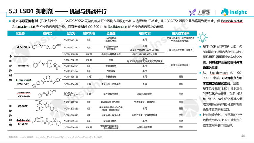 据 Insight 数据库显示,多家 MNC 已将 LSD1 纳入了研发管线,国内也有 6 家企业紧随其后。当前该靶点的肿瘤药物全球有 38 个,均为化药。目前国内 3 个,国外 12 个药物已进入临床研究。