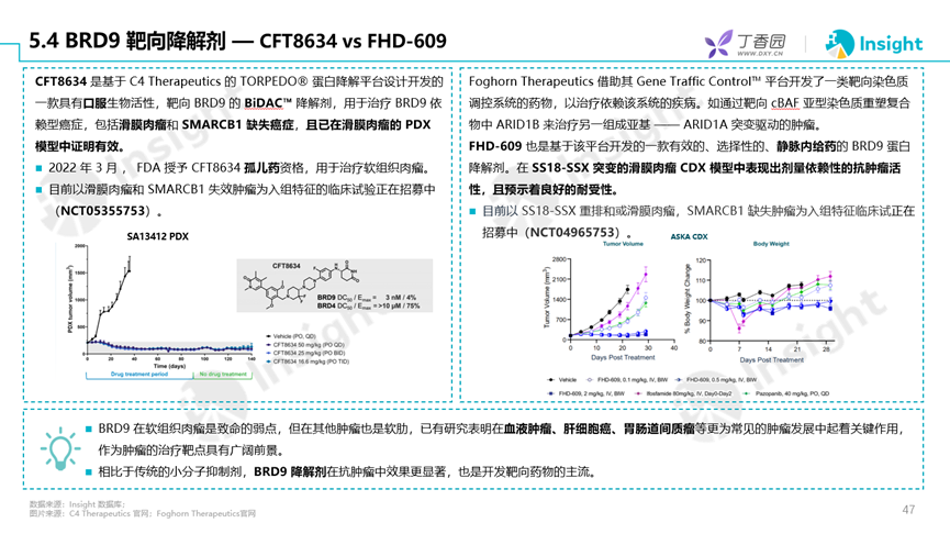 BRD9 是 SWI/SNF 复合物(ncBAF 亚型)的亚基之一,研究表明,该靶点在在软组织肉瘤、血液肿瘤、肝细胞癌及胃肠道间质瘤中发挥关键作用。BRD9 降解剂在抗肿瘤中效果更显著,也是当下开发靶向药物的热门领域。