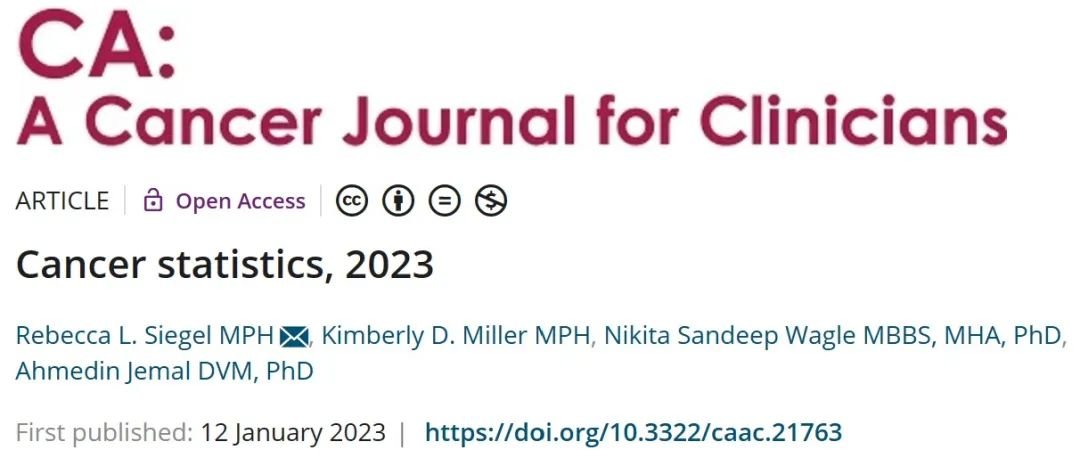 2023年1月,世界上发行量最大的肿瘤学期刊《临床医师癌症杂志》(《CA: A Cancer Journal for Clinicians 》,IF=286)发表了来自美国癌症协会的Rebecca L. Siegel团队的最新论文:“Cancer statistics, 2023”,该研究提供了2023年美国及各个州新发癌症病例和癌症死亡病例的估计数量以及最新的基于人群的癌症发病率和死亡率数据的统计数据。