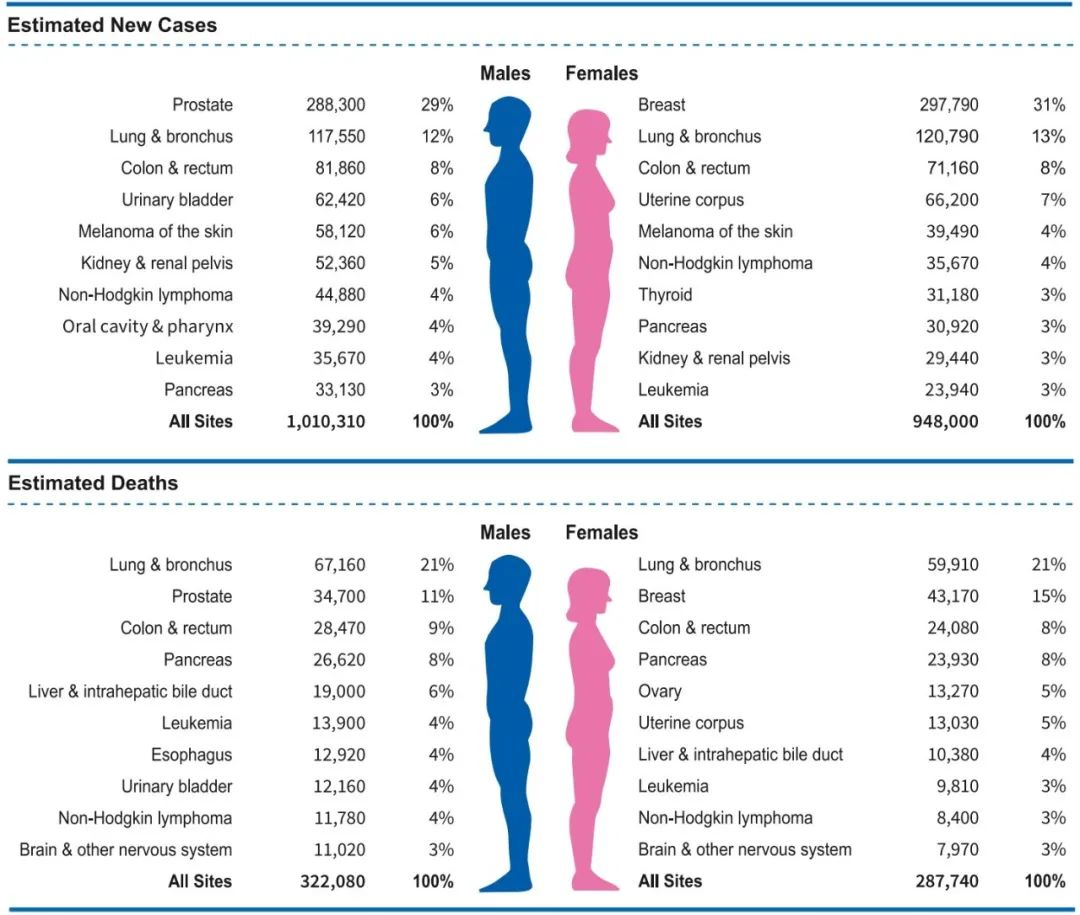 总的来说,美国2023年预计将出现1958,310例新的癌症病例,相当于每天5370例。预计癌症死亡人数609,820人,相当于每天死亡1670人。