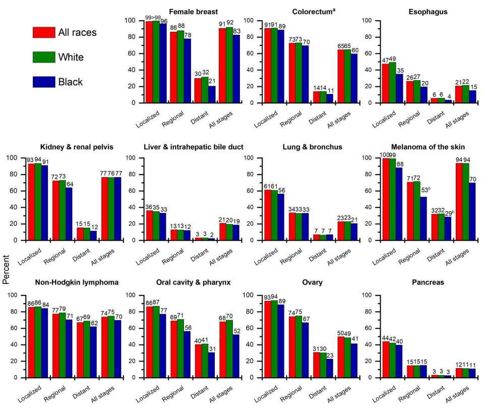 随着医疗水平的快速发展,癌症的生存率也有了明显的提升,20世纪70年代中期,癌症的5年相对生存率仅为49%,2012年至2018年癌症的5年相对生存率增加到68%。研究人员根据种族和诊断阶段细化了各种癌症的5年相对生存率,可以看到除了胰腺癌和肾癌在黑人和白人中具有相似的生存率外,其余每种癌症类型中黑人的5年生存率都低于白人。从绝对意义上讲,黑人和白人之间生存差异最大的癌症依次是黑色素瘤(24%)、宫颈癌(20%)、口腔和咽部癌(18%)、膀胱癌(13%)。