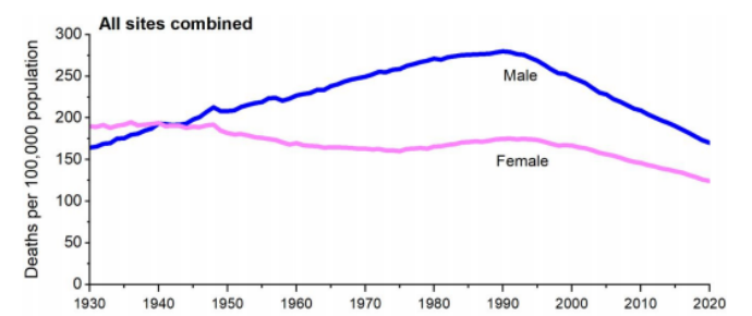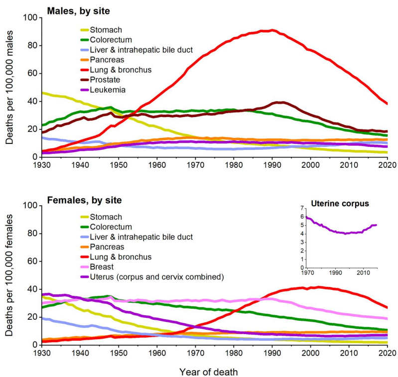 一般而言,死亡率是比发病率或存活率更好的抗癌进展指标,因为死亡率较少受到检测实践变化带来的偏差的影响。在20世纪的大部分时间里,癌症死亡率上升,主要原因是烟草流行导致男性肺癌死亡人数迅速增加。然而,吸烟的减少以及某些癌症的早期发现和治疗的改善,导致癌症死亡率自1991年达到每10万人215.1人的峰值后持续下降。