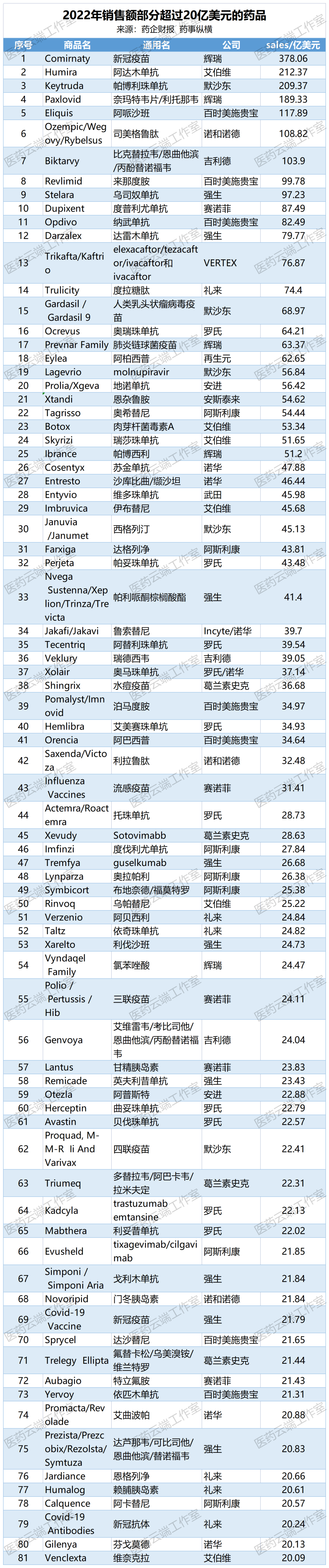 2022年排行榜最大的竞争当然来自默沙东的K药与艾伯维的修美乐,这是财报发出前最大的悬念,因为K药的成长性及增速都超过修美乐。因此,在默沙东财报出来但艾伯维财报未披露之前,业界很多人隐隐觉得K药将一举超过修美乐,成为新一代的“药王”。不过,艾伯维公布财报之后,修美乐还是以212.37亿美元的销售额位居第一,但默沙东K药209.37亿美元从数字上已经很接近,而且势头不减,如果2023年度不出意外的话,K药将取代修美乐的地位。排在后面的产品有辉瑞的P药,销售额为189.33亿美元,与comirnaty类似,随着新冠疫情趋于缓和,销售量下跌是大概率事件,但辉瑞这两个产品在2022年合计销售567.39亿美元,这个数字也是非常令人惊叹的。