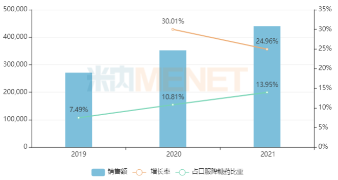 近年来,DPP-4 抑制剂 (不含复方制剂) 中国市场规模呈快速扩容态势。米内网数据显示,2021年中国三大终端6大市场口服降糖药销售规模超过300亿元。其中,DPP-4抑制剂 (不含复方制剂) 销售规模已突破40亿元,同比增长25%,销售占比逐年提升。