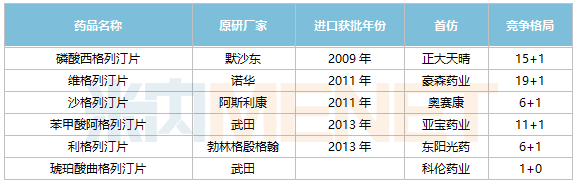 6款已上市DPP-4抑制剂首仿药获批企业分别为正大天晴(磷酸西格列汀片)、豪森药业(维格列汀片)、奥赛康(沙格列汀片)、亚宝药业(苯甲酸阿格列汀片)、东阳光药(利格列汀片)、科伦药业(琥珀酸曲格列汀片)。目前西格列汀、维格列汀、阿格列汀等3个品种获批企业已超过10家,其中维格列汀片获批仿制企业高达19家。