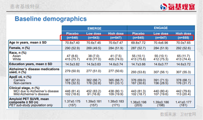 Aduhelm获批上市是基于一项名为EMERGE的三期临床试验。在这项临床试验中,安慰剂组、低剂量治疗组和高剂量治疗组患者数量都在500人以上。