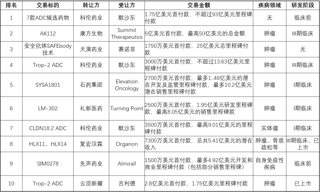 科伦药业的7款ADC管线虽然以93亿美元成为中国License-out金额最高的交易,但却仅获得1.75亿美元的首付款,只能排到榜单的第8位,后续能够拿到多少比例的里程碑,依然需要后视后续研发成果而论。