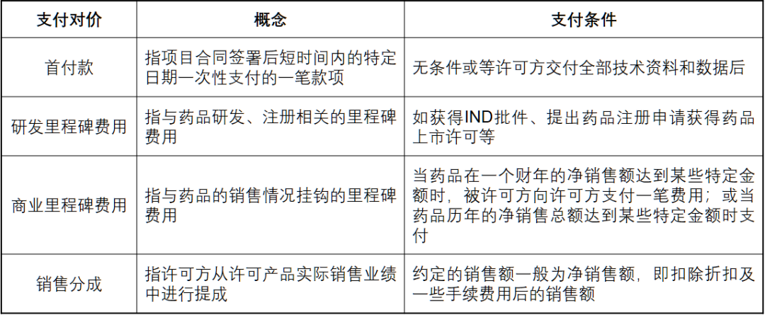 License out的交易总额中一般包括首付款、里程碑费用以及销售分成。其中里程碑费用又分为研发里程碑费用、商业里程碑费用。