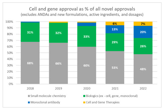 近年来,细胞和基因疗法获得了大量媒体关注和行业投资,即使在现实世界中部署有限,而且第一种疗法直到 2017 年才获得 FDA 批准。到 2022 年只有27 种 FDA 批准的 CGT,约占 340 种获批生物药产品的 8%,仅占常规药物的一小部分。然而,在审视被批准的真正创新药物的构成时,CGT 继续占总获批药物的较大比例。