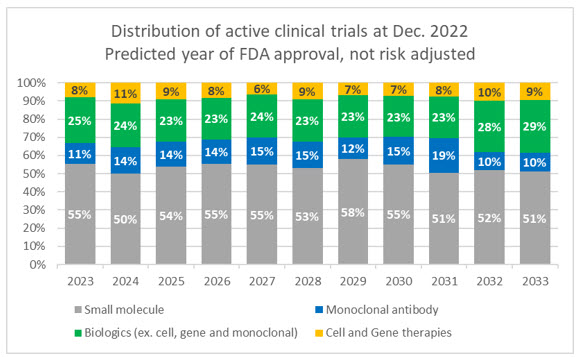 在截至 2022 年 12 月所有正在进行的 CGT 试验中,大多数发起方希望在未来6年内向 FDA 提交申请,其中约 16% 处于 3 期。鉴于开发和审批过程中的已知挑战,许多这些试验将被放弃,后期将延长,但管线仍然强劲,新的试验开始的速度越来越快。