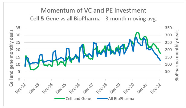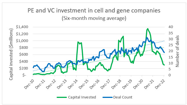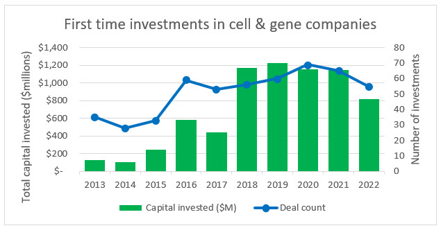 去年是生命科学交易令人失望的一年,尤其是相比我们在 2020 年和 2021 年看到的破纪录数字。CGT 公司也未能幸免于这些市场条件,私募融资和首次公开募股确实从 2021 年的高峰期开始放缓。然而,该行业的长期趋势表明,不仅来自创新领导者和早期投资,而且来自公开市场,对CGT的支持和兴趣越来越大。