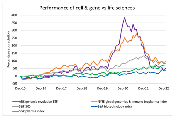 话虽如此,对于公众投资者(和商业领袖)来说,将炒作与科学分开并认识到监管批准和盈利的漫长而复杂的道路是很重要的。使用两个最大的细胞和基因指数作为其生物技术和制药同行的基准,很明显,对未来价值的预期是强劲的,但与五年前生物技术出现时的情况相当。然而,大流行刺激了 CGT 和相关疗法的涌入,并导致了大规模的高估。随着大流行的消退和市场的正常化,CGT 行业的表现仍然优于生物制药和更广义的市场。