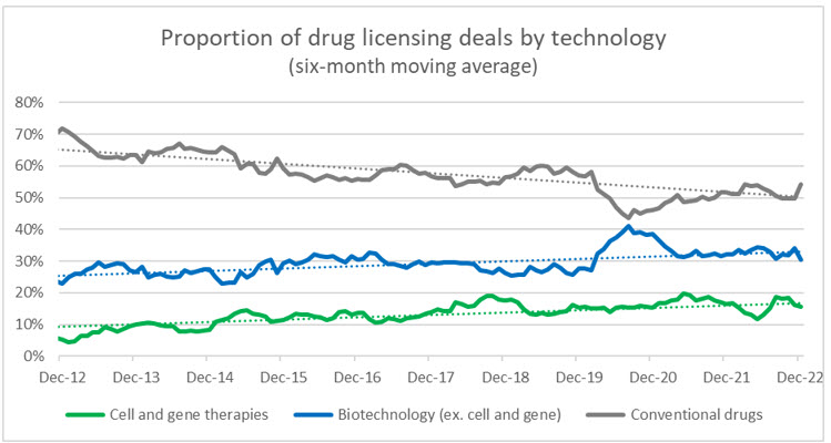 我们预计这将刺激战略企业参与者确定收购或合作伙伴关系,以实现管线现代化,并为未来的研发提供技术加速器。细胞和基因疗法无疑是该计划的重要组成部分,随着越来越多的 CGT 获得积极的临床结果并获得 FDA 批准,我们还将看到人们对传统药物和生物技术公司的偏好更加迅速地转变。使用药品许可交易作为代理,在过去十年中,CGT占所有许可交易的比例从 5% 上升到 15%(生物技术从 23% 上升到 33%,传统技术从 72% 下降到 52%)。