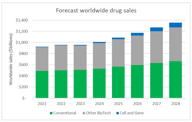 除了为公共卫生和罕见疾病的治疗提供利益外,细胞和基因疗法还将有助于迎来下一代药物,成为药物销售的推动力。虽然 CGT 占 2022 年全球销售额的 1% 略多一点,但预测的增长率令人震惊。从 2022 年到 2028 年,传统药物和非 CGT 生物药的销售额预计将实现 5% 的复合年增长率,而 CGT 预计将实现 46% 的复合年增长率,到 2028 年销售额约为 860 亿美元。