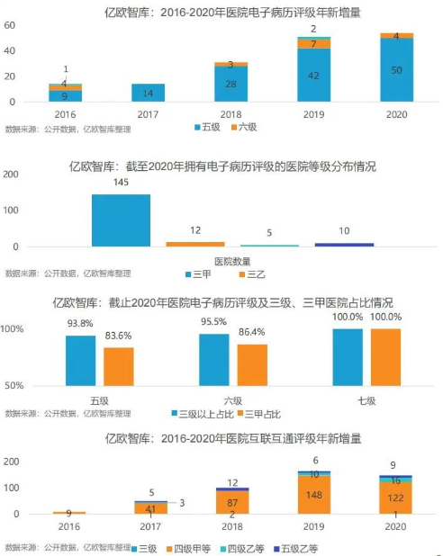公立医院诊所的数字化探索,多由三甲医院领头,案例相对成熟后,再向下级机构延伸。医院诊所的数字化探索方向较多,包括如电子病历5级建设、互联互通、辅助决策、远程诊疗、物联网智慧管理、软硬-体化等多个方向。其中,电子病历与互联互通有明确评级指标且与医疗机构自身评级息息相关,因此最为成熟。数据显示,截至2020年,全国总共有172家医院获得电子病历评级,其中三甲医院为145家,占比84.3%; 三级医院总共为162家,占比94.2%。对于互联互通,则从2016年的9家增长到2020年的148家。