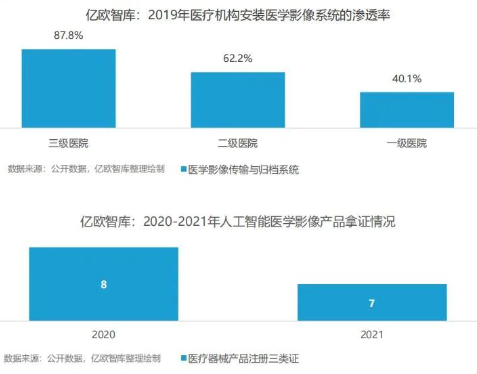 2019年开始,人工智能医学影像部分企业开始将问题聚焦于如何优化产品,基础数据质量的提升及算法的不断改进优化,外加大量的科研合作,使得人工智能影像产品逐渐被医院端接受和认可。作为软件产品,87.8%的三级医院已使用医学影像信息化系统,作为AI产品主要落地的医疗机构,三级医院已为其建立了良好的信息化基础。人工智能医学影像产品陆续取得三类证,已具备向患者收费的资格。