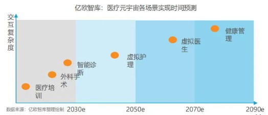 随着科技的不断进步、政策的逐渐清晰、医疗数据的确权与流通规则明确,元宇宙与各医疗场景融合程度将不断加深。考虑到VR、AR、 MR、脑机接口等技术与医疗场景交互的复杂程度,元宇宙技术下的医疗培训、外科手术等将在未来几年逐渐实现,而虚拟医生、个性化健康管理等则需要较长时间的数据沉淀与技术积累。